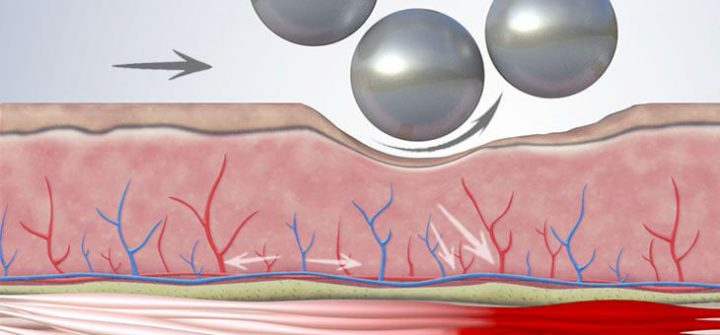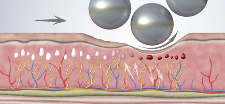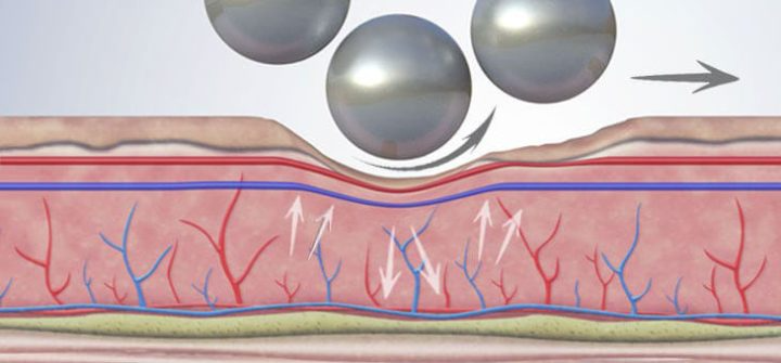 Håndstykket har en roterende sylinder med 55 silikonkuler som glir over huden og skaper lavfrekvente vibrasjoner som trenger dypt inn i vevet. Dette stimulerer lymfesystemet til å drenere væske og fjerne avfallsstoffer, bedrer mikrosirkulasjonen og aktiverer fibroblaster til å produsere mer kollagen og elastin. Resultatet er fastere, jevnere og mer elastisk hud samt reduksjon av linjer.
